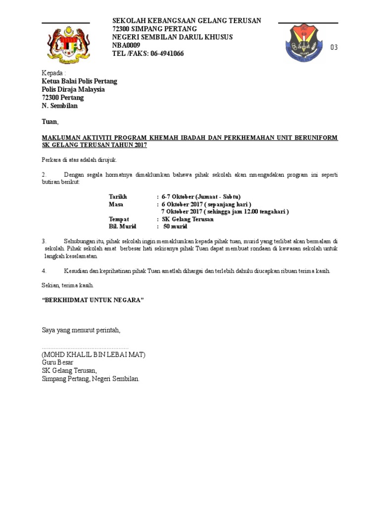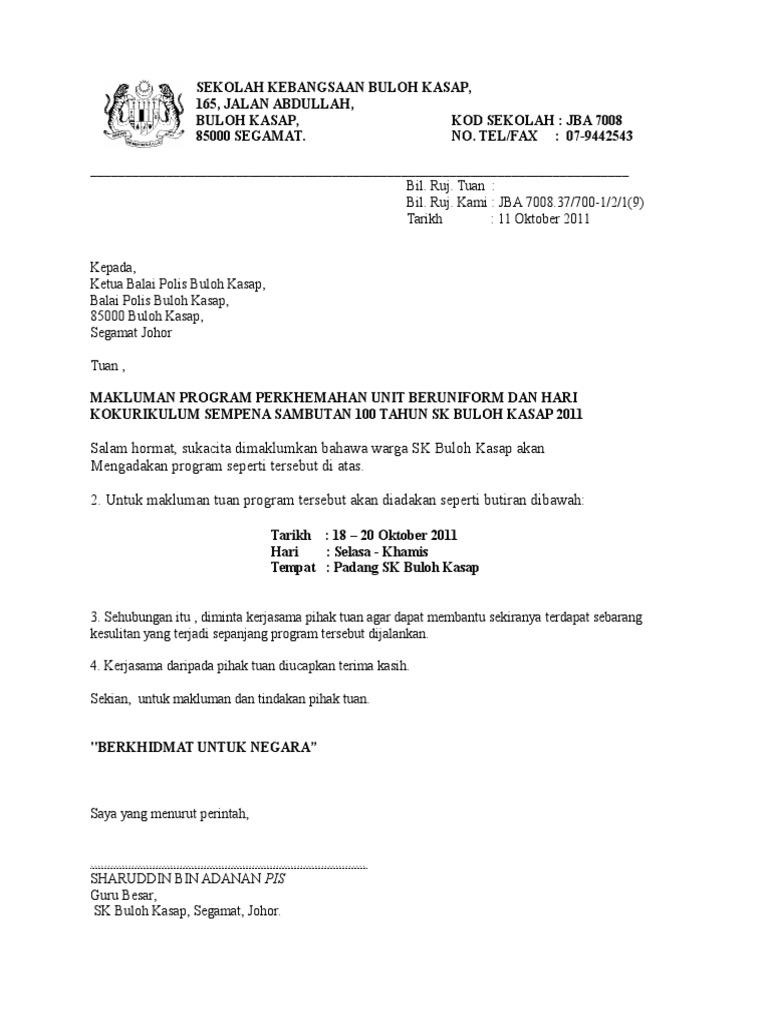 Contoh Surat Makluman Perkhemahan. Ini adalah contoh surat makluman kepada pihak polis tentang aktiviti yang ingin dijalankan di sesuatu tempat. 089-925739 Kod Sekolah.